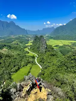 One of the most iconic viewpoints in Vang Vieng is undoubtedly Nam Xay Viewpoint. This stunning spot is a must-visit during your trip. It is famous for its motorbike at the top of the mountain, surrounded by breathtaking landscapes and lush nature.