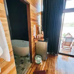 🏩 Looking for a relaxing riverside getaway in Laos with a peaceful, uncrowded atmosphere perfect for a relaxing and restful getaway? We recommend "Angnamtong View Resort." This small resort nestled amidst lush nature offers mountain and river views everywhere you look, surrounded by large trees and a cool breeze all day long. Perfect for those seeking a truly relaxing getaway without rushing. The accommodations are simple wooden houses with balconies extending out to offer a full view of the Angnamtong Reservoir. In the morning, the sunlight gently streams down onto the water's surface, creating a stunning, untouched beauty. In the evening, enjoy a relaxing sunset with a cup of coffee or a cold beer. It's truly a "nature therapy" experience. The rooms are clean and comfortable, with both air-conditioned and fan rooms. They have large beds, soft blankets, and comfortable pillows. The hot water works well, and there's a TV and a mini-fridge with instant coffee available in the morning. The bathrooms are also clean and have decent power showers. For those seeking privacy, we recommend booking a detached house, which offers a more open view than the adjacent houses. Another impressive feature is the resort's friendly and welcoming owners, making it feel like you're visiting relatives in another province. A simple local breakfast is served, including pork congee, fried eggs, toast, and hot, fragrant coffee. If you're craving local dishes like "larb pla" or "kaeng nup mai," just ask the resort and they'll make it for you. Overall, Angnamtong View Resort is a perfect place to relax, take it slow, and enjoy the sounds of flowing water and fresh air, feeling like you've escaped the hustle and bustle of the city. If you have the chance to visit southern Laos, we highly recommend stopping by for a night. You'll definitely fall in love with the natural charm of this place. 💚