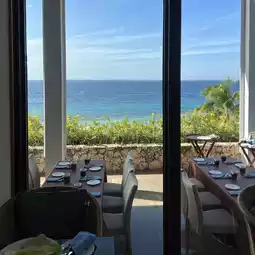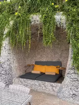 Outdoor seating with an ocean view and a private cave