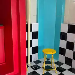 This shop stands out from the front with bright yellow-blue-red tones alternating with a checkerboard pattern that makes you want to take a photo immediately! Inside is just as cute, with cool patterned walls, a lightbox corner, and blue arched window frames that social girls will love 📸✨