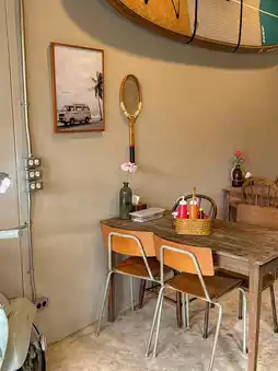 A cozy brunch spot full of positive energy, serving homemade-style savory and sweet dishes, with a cute and warm atmosphere like eating at a stylish friend's home.