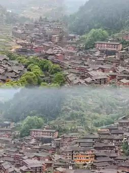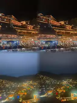 Geographical features: Built along mountains and rivers, thousands of traditional Miao stilt houses cascade down two hillsides. When illuminated at night, it resembles the dreamlike world of "Spirited Away."