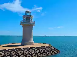 Upon entering the resort, the winding coastline and uniquely charming natural scenery first catch the eye (see Image 1). A robust, lush tree stands in harmony with the reefs and stone mortars, backed by the vast blue-green ocean. The sky is clear and bright, palm leaves gently sway, sketching a rich tropical coastal atmosphere. Walking along the wide stone boardwalk deeper inside, a gray-white lighthouse stands majestically amid the blue waves (see Images 2 and 3), serving both as a maritime landmark and a romantic spot for visitors to pause and take photos. In the distance, the shimmering sea and scattered fishing boats fully reveal the vastness and tranquility of the ocean.