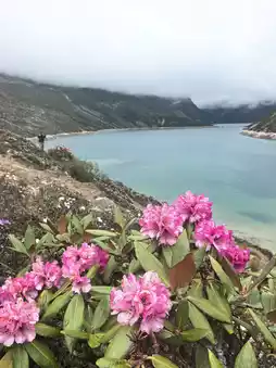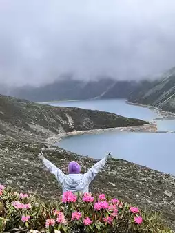 With milky-white waters, this is the best spot to view the reflection of Kula Kangri. From May to June, alpine rhododendrons bloom around the lake.