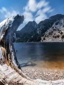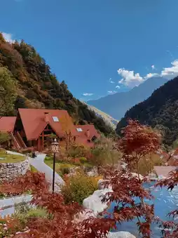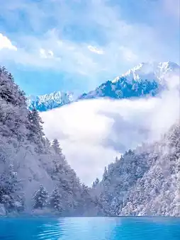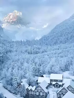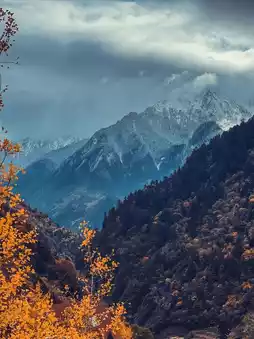 Vast snow-capped mountains in the distance, surrounded by forests up close