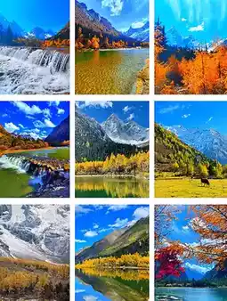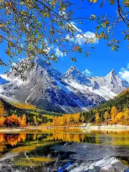✅ **Golden hues intertwined with snowy peaks**: Snow mountains, lakes, and colorful forests in one frame