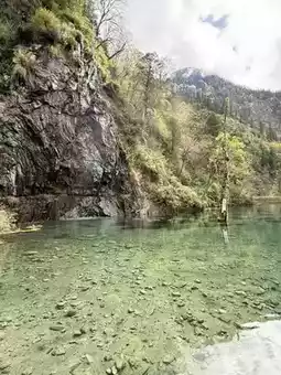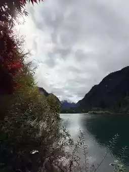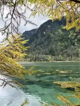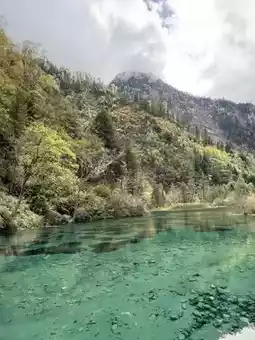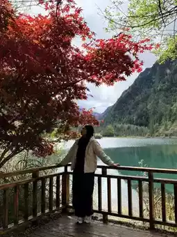 #FallingLeaves in Bipenggou in October. The trees and grasses begin to turn vibrant colors of yellow, orange, and red, filling the forests and mountains. It's truly beautiful, with the white snow on the peaks and the lake reflecting the green and red from the trees along the edge. It's truly stunning. Visiting here during this time is truly worth it. The weather is cool and pleasant to walk around.