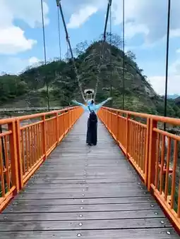 Just as we were immersed in the scenic beauty, a breathtaking aerial performance began at Bida Pavilion. High above, "knights" rode the wind on spinning wheels, drawing cheers from the mountainside. Mid-air, performers in flowing ancient costumes soared on wires, executing graceful movements like celestial beings descending to earth. Their ethereal figures blended seamlessly with the surrounding landscape under the blue sky and white clouds, creating a mesmerizing spectacle. During the intermission, a magician took the stage, his skillful hands conjuring wonders—like a fluttering white dove appearing from thin air—eliciting gasps of amazement from the audience, especially the excited children who clapped and danced with joy.