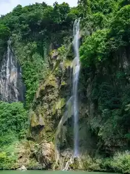 Waterfalls cascade under the☀️ sun, framed by lush forests, winding rivers, and peculiar rock formations