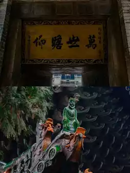 The mountain gate is a resting mountain top, with six layers of Ruyi bucket arches supporting the glazed tile roof, and the wooden relief hanging flower door cover is carved with Buddhist figures and auspicious beasts🦁. The vertical plaque of 'Xie Tian Da Di' hangs on the door, and the stone carved plaques on both sides of the side door are 'Lv Zhong' and 'Dao He', and there are stone carved couplets on the shadow wall👏.
