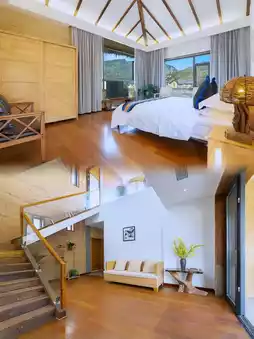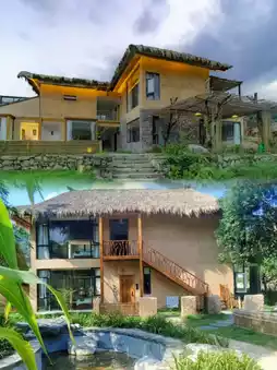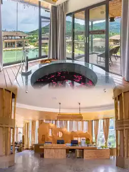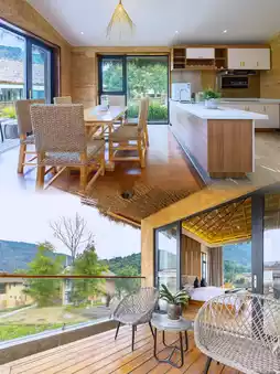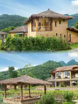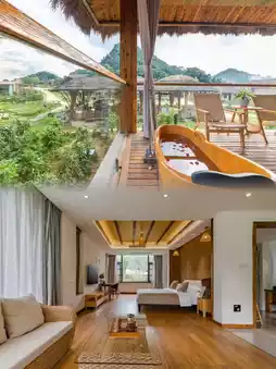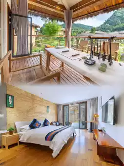The room decor is simple and elegant, with warm yellow wooden floors complementing the earthen walls, and the natural light from the floor-to-ceiling windows makes the rooms bright and airy. The rooms feature wooden barrel bathtubs for experiencing the characteristic Yao bath, and through the windows, you can gaze at the rolling hills not far away.