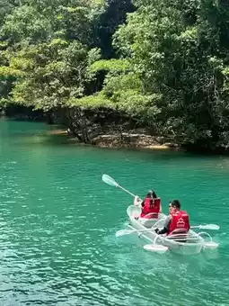 Wooden paths and natural trails winding through dense subtropical rainforest and karst limestone terrain.