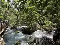 The Emerald Valley Waterfall features water flowing down layered rock walls, surrounded by lush greenery, resembling jade beads cascading down. This tranquil spot is perfect for sitting quietly and enjoying the natural symphony of waterfalls and birdsong.