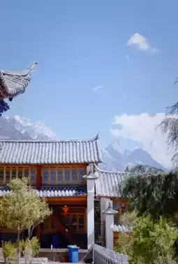 The Fuguo Temple has a cross-shaped layout, three bays wide, and its main building is the Wufeng Tower, facing Yulong Snow Mountain. Vegetarian meals are available at noon.