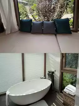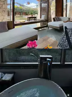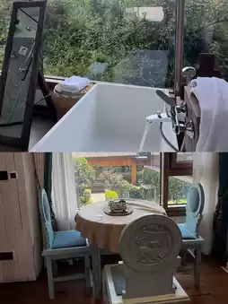 ✅The bathroom has a heated towel rack, L'Occitane toiletries 🧴, and the view from the large floor-to-ceiling window in the bathtub 🛁 is amazing. It is a pleasure to soak in the bathtub and enjoy the snow-capped mountains. The skylight design allows you to lie in bed and watch the stars at night.