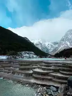 It’s definitely one of the most beautiful places that I have ever seen in China. I travel to Lijiang during the Spring Festival but the weather was pretty comfortable. But I couldn’t but go to see this place. The landscapes are amazing, I couldn’t believe my eyes! The territory is pretty big, the valley starts from the Blue Moon Lake, the colors of which is unbelievable. The entrance to the lake territory costs 50 RMB. But you can just watch from aside. You can have a walk for about 30 mins inside the park and take the beautiful pictures. There are some stores with the local souvenirs and the snacks if you get hungry. After that, you can take a bus (the Jade Dragon Snow Mountain ticket includes all the transfers in the park territory) or catch the small open private cars that will bring you to the cableway territory. The ticket for cableway is 100 RMB that we bought right in the first entrance before the Blue Moon Valley. The cableway brings you to 4506 meters view point. In the hall you can buy the oxygen spray can, water and snacks, or take a rest inside. There are clean and warm toilets, too. From the point where the cableway comes, there are stairs where you can get 5000+ meters point but it was snowing heavily the day before, so we couldn’t go there.