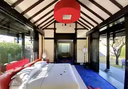 5. The Naxi-style courtyard has a traditional appearance, while the interior is a modern facility with exotic charm. The villa room type here does not have obvious boundaries between the bedroom, living room, and bathroom. When you push the door in, the bedroom is in the middle, facing the snow mountain. On both sides of the wing room, one is the bathroom space and the other is the study room. There are partition doors that can be opened or closed freely to ensure that each space is independent and private.