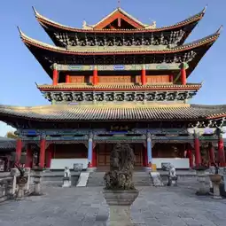 Wangugu Tower is a loft with flying eaves and upturned corners. It has a total of 13 upturned corners, which symbolize the thirteen peaks of Jade Dragon Snow Mountain. The building is decorated with 2,300 auspicious patterns such as stars and the moon, symbolizing the 23 ethnic groups in Lijiang.