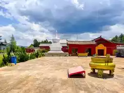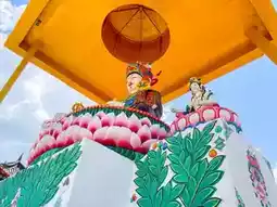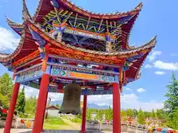 Lianshang Buddha Statue is a unique Buddhist statue in Lijiang influenced by Tibetan Buddhism, known for its large scale and distinctive appearance. Surrounding the statue is a spacious park where colorful Tibetan prayer flags, known as 'Dar Cho', flutter in the refreshing breeze, creating a mystical atmosphere.