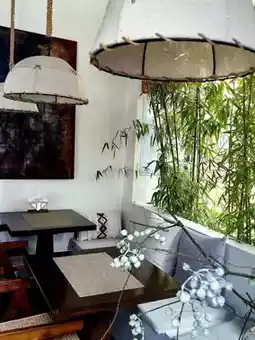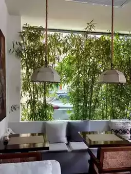 - The dining room is embraced by bamboo groves and greenery, where the rustic feel of hemp rope pendant lights blends with the softness of fabric furnishings. Eating here feels like being in a secret cabin in the forest, with the breeze passing through the bamboo, adding a touch of wild charm even to the food;