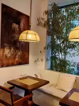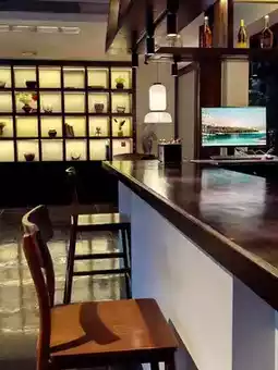 The interior is full of thoughtful details: wooden antique shelves display porcelain vases and dried flowers, woven pendant lamps above the dining table emit a gentle glow, and rattan chairs paired with ethnic-style tablecloths perfectly blend local flavor with artistic sense. The deep brown wood of the bar counter shines with the luster of time, and together with the vintage items on the display shelves, tells the story of the homestay’s meticulous care.
