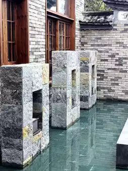 Stepping inside feels like entering a fusion painting of Jiangnan and Naxi cultures. Walls built with gray-white bricks and stones, Chinese-style details with black tile eaves, paired with a courtyard featuring flowing water and rugged rock formations—every step is a frame of elegant Eastern aesthetics 📸.