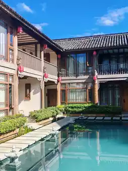 Opening the rustic wooden door of Boxinyunshe·Wenyuan feels like an instant time travel. White walls and black tiles blend with the blue sky, wooden carved window frames cast mottled shadows, and every corner resembles a carefully composed ink painting 🎨. The tranquil pool in the center of the courtyard is breathtakingly beautiful, with the water clearly reflecting the green-tiled eaves, lush branches, and occasionally passing clouds 💧. Sitting by the pool, watching the sunset light dance on the water, time here slows down and softens.