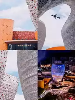 The iconic building complex in Liling is made of bowls, vases and other utensils. Under the blue sky and white clouds, it looks like a colorful abstract oil painting. The museum in it records the history of the city of Liling.