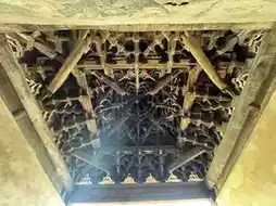 The Yuan Dynasty stage is the most beautiful, with a cross-hipped roof, grand flying eaves, and a three-layered inner eave beam frame forming an eight-trigram-shaped caisson. The overall image is dignified and atmospheric, with exquisite details.