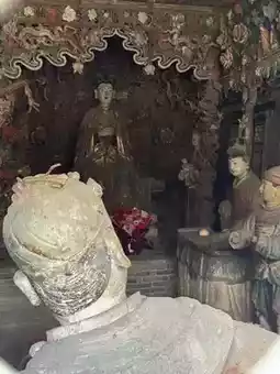 The door of the Holy Mother Hall is locked, and one can only peek at the Ming Dynasty colored sculptures through the broken window paper.