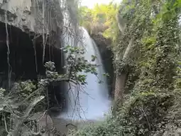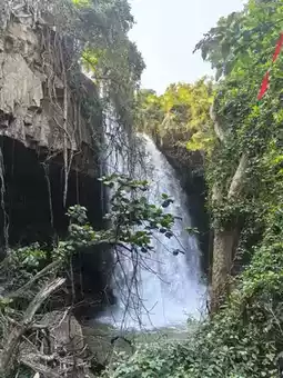 The waterfall is formed by a drop in the riverbed, with a height of 20 meters and a width of about 20 meters, creating a magnificent sight. At the top of the west side of the waterfall stand two ancient banyan trees, with several large stones at their base, one of which is inscribed with the words "Mountain Valley Waterfall". The waterfall is surrounded by strange rocks of various shapes, and the trees behind it are lush and green. The waterfall cascades down like a dragon spitting pearls, creating a spectacular sight. In front of the waterfall are two real peacocks for visitors to take photos with, free of charge. Under the strange rocks is a large black cave, known as "Guanyin Cave", where the waterfall cascades down the cliff like smoke and mist, blocking the entrance to the cave, reminiscent of the Water Curtain Cave in Journey to the West. Near the waterfall is a temple dedicated to Lady Xian, where visitors can learn about the local history and culture.