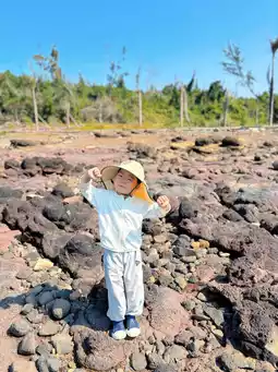 The black-brown volcanic rocks are magnificent, and this is a great place to go tidepooling. After the tide recedes, there are many clams and small crabs on the beach. Bring a small shovel and bucket to collect them all💯