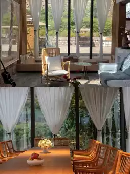 Large floor-to-ceiling windows, the river flowing outside the window, surrounded by mountains, the sky is blue, the water scene reflects the mountain view, it is beautiful
