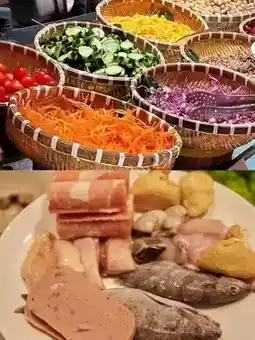 The hotel's Shunde Restaurant specializes in Cantonese cuisine and seafood, while The Bistro offers a seafood buffet dinner. The breakfast spread is diverse with fresh ingredients.