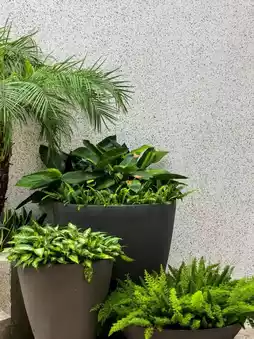 - Indoor corners feature layered greenery in dark planters—monstera and ferns complementing each other against rough-textured walls, blending wildness and refinement in a microcosm of naturalism.