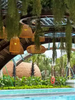 - The pool area is a true delight! Cascading hanging plants mirror the woven rattan lamps and rippling water, amplifying the vacation vibe. Lounging here feels like signing a "relaxation pact" with nature🌴