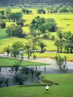 Surrounded by mountains on three sides⛰️, streams, green trees, grasslands, and sheep together compose a pastoral landscape painting, as if in Xinjiang