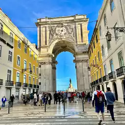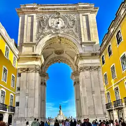 Today we’re in Portugal’s capital, Lisbon! The first stop is the impressive Arco da Rua Augusta, a grand triumphal arch that leads straight into the lively Praça do Comércio. Facing the Tagus River and surrounded by golden-hued buildings with a statue of the king at its center, the square truly reflects the glory of Portugal’s seafaring past.
