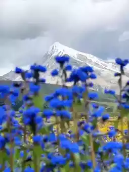 🎬 Creative idea: Place a small mirror in the flowers and photograph the reflection of the snow-capped mountains and wildflowers. The combination of reality and reflection creates a super atmospheric effect.
