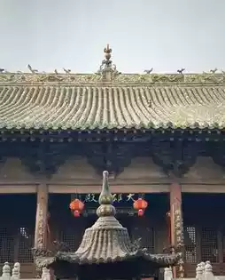 Existing buildings from the Song, Jin, Yuan, Ming and Qing dynasties, covering an area of 7,380 square meters. There are five courtyards and thirteen halls in the temple. Its representative building is the eight halls of "One Jin and Seven Yuan". It is a rare multi-dynasty temple. Among them, the well-preserved Jin Dynasty brick carvings in the hall and the unique black-glazed glazed roof are precious cultural relics and are praised by relevant cultural relic experts as a rare ancient building group in China.