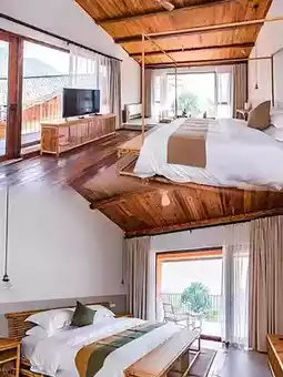 The village's rammed earth house has 13 guest rooms. Whether in the public area or the rooms, everything blends into the natural environment, spacious and comfortable. The public area is built with local materials, and the interior decoration style retains a rustic charm, making sleep very relaxing. The morning sunlight through the window on your face, that warm feeling, is unforgettable.