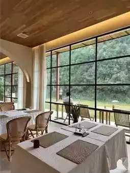 The second, third, and fourth floors are guest rooms, each with huge floor-to-ceiling windows overlooking stunning tree views. Sunlight streams through the large windows, blending the indoor and outdoor greenery into one.