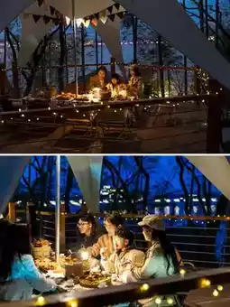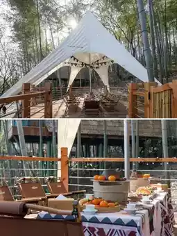 Coming to the back mountain, a wooden walkway opens up to a camping site 🏕️Chat about camping during the day, and stargaze at night. White tent tops are propped up on the railings, colorful flags hang overhead, and a row of camping chairs and a long table are set up. Surrounded by bamboo forests, it is a great place for camping.