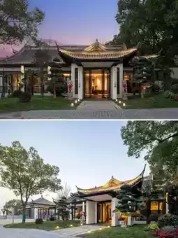 🛖 The treehouse shapes are scattered in the lakeside garden, with the wild tribe hidden behind the traditional southern architecture