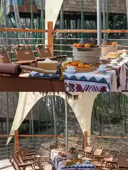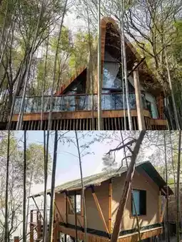 Each room type has a different theme, starting with poetic names. For example, there are the Starry Sky Treehouse Room, the Wilderness Tent Room, and the Bird's Nest Family Room. Stepping into the room, you can feel the natural fragrance from the log furniture. From the ceiling to the floor, to the furniture and even the bed, walnut wood-colored wooden furniture is used. Among the fine textures of the wood, it feels as if you can become one with nature here. The ceiling has a pointed structure, which gives a sense of extension to the space. Also worth mentioning is the large floor-to-ceiling window that makes up an entire wall, allowing you to feel connected to nature even indoors, with the sounds of cicadas and birds close at hand, which is really comfortable!