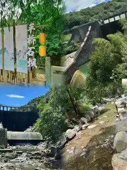 This dam is the largest non-reinforced concrete reservoir dam in China. Climbing the high steps to the top of the dam offers a beautiful view, with a vast lake on one side and a waterfall with a significant height difference on the other. In the distance, you can see lush green trees.