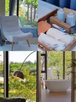 Large floor-to-ceiling windows overlook green rice fields, like a painting.