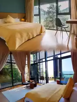 The tree house here is really awesome👏! I live in a one-bedroom tree house, which is 70 square meters and very spacious. The 270-degree viewing balcony is absolutely stunning, with lush green scenery all around, as if you were living in the forest. The facilities in the room are also very complete, with a separate cloakroom and smart washing and care, making it super comfortable to live in 😌. In addition, welcome fruits and various free drinks (except red wine 😉) were thoughtfully prepared in the room.