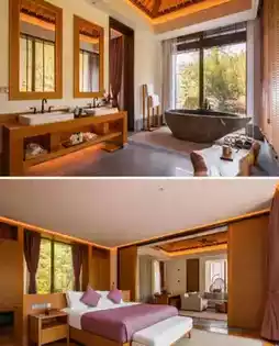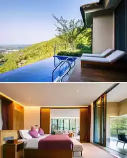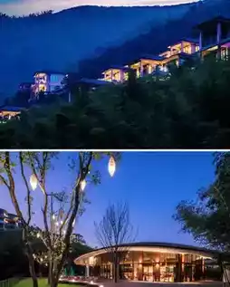 The hotel inherits the tranquil and secluded atmosphere of the wilderness, located in 35,000 acres of mountains and forests, with two 5A-level scenic spots, Nanshan Bamboo Sea and Yushui Hot Spring. 50 all-bamboo hot spring single-building hotels are neatly arranged along the narrow banks of the valley, standing on the top of the mountain, hidden in the bamboo sea. At night, the lights flicker like golden jade belts falling from the mountains.