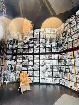 A transparent book tower that lights up at night. It's recommended to visit in the evening.